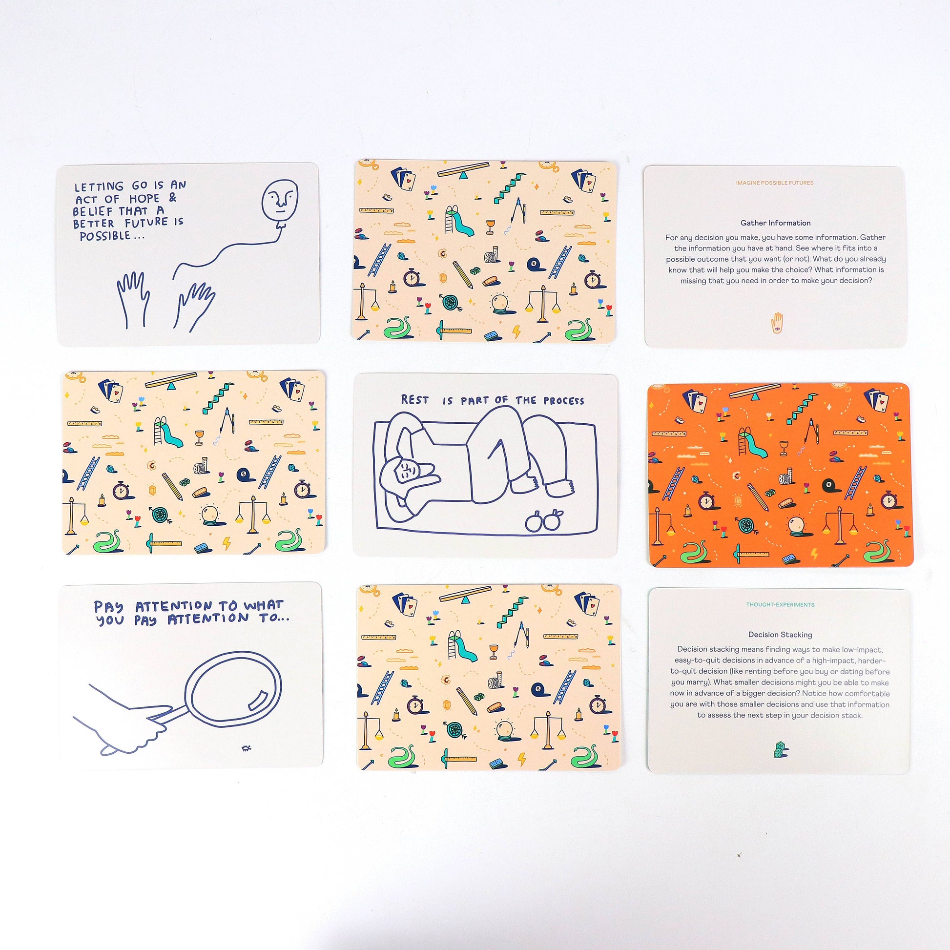 When you feel stuck, draw a card and explore its prompt to compare possible futures, think differently, and move forward with clarity and confidence. Designed in collaboration with Annie Duke, bestselling author of Thinking in Bets and How to Decide, this deck empowers you to own your decisions — no crystal ball required.