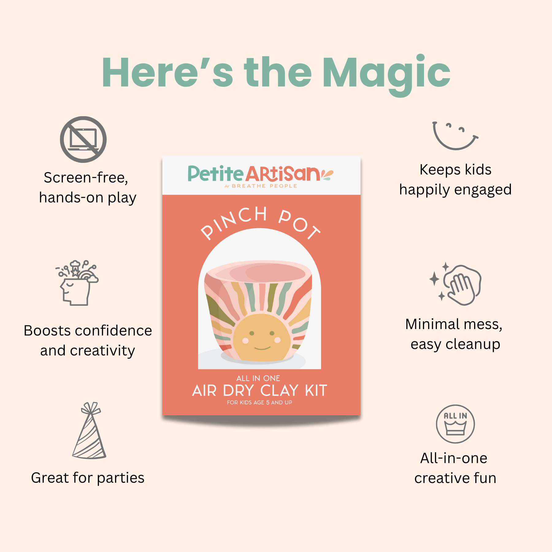 Let kids’ imaginations come alive with the Kids DIY Clay Kit — a fun, screen-free activity perfect for ages 5 and up! Designed to spark creativity and confidence, this beginner-friendly kit gives little artists everything they need to shape, paint, and decorate their very own trinket dishes.