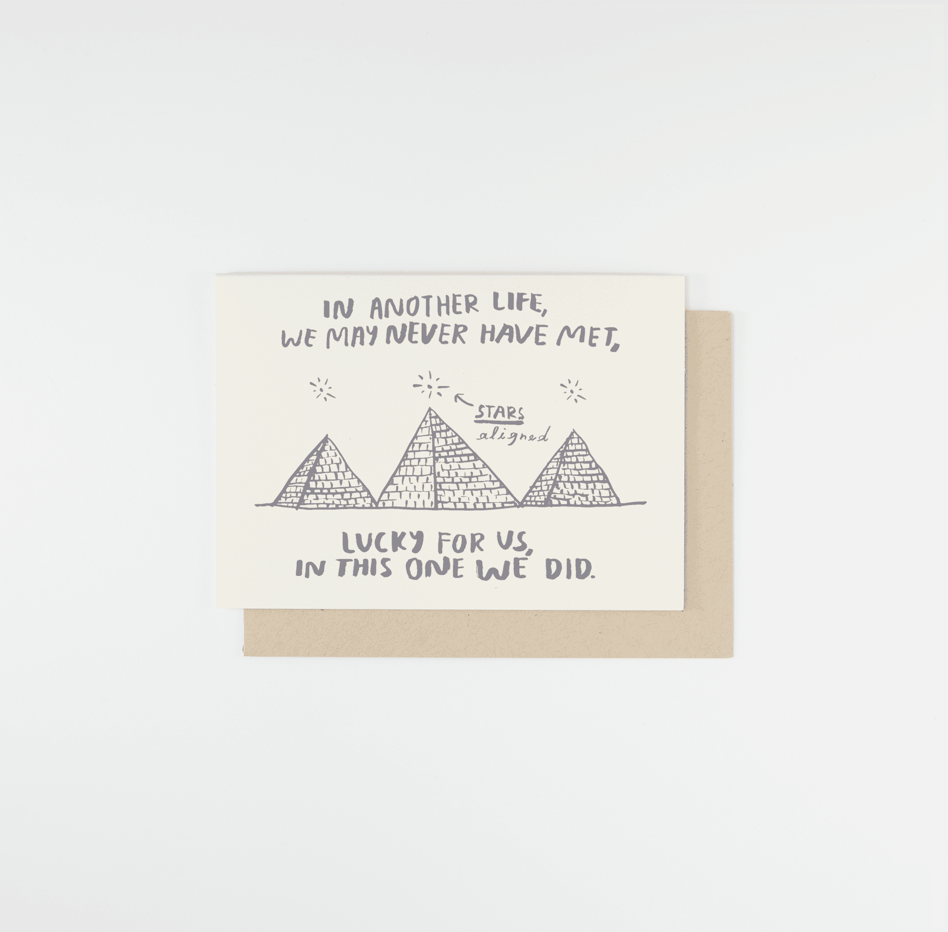 We might don't need Ancient Egyptian astronomy to know when love is real, but let's thank our lucky stars anyway. Cheers for when love lasts a lifetime (or two or three). 3.5 x 5 inches Letter-pressed greeting card printed by hand on archival-quality card stock with a Kraft envelope