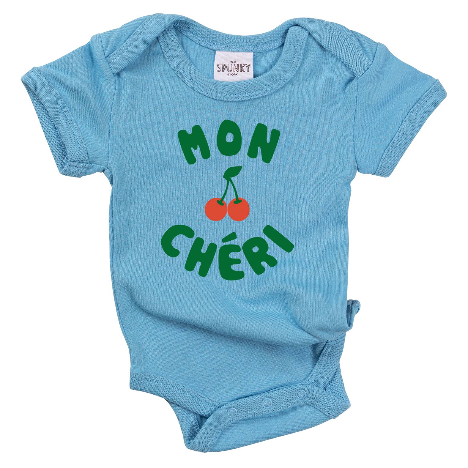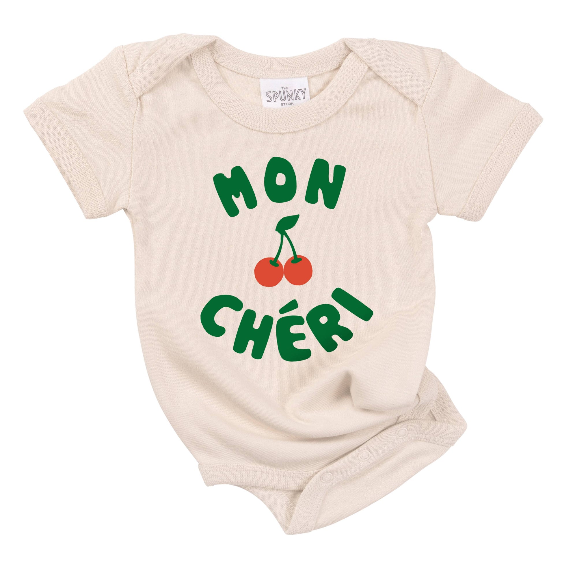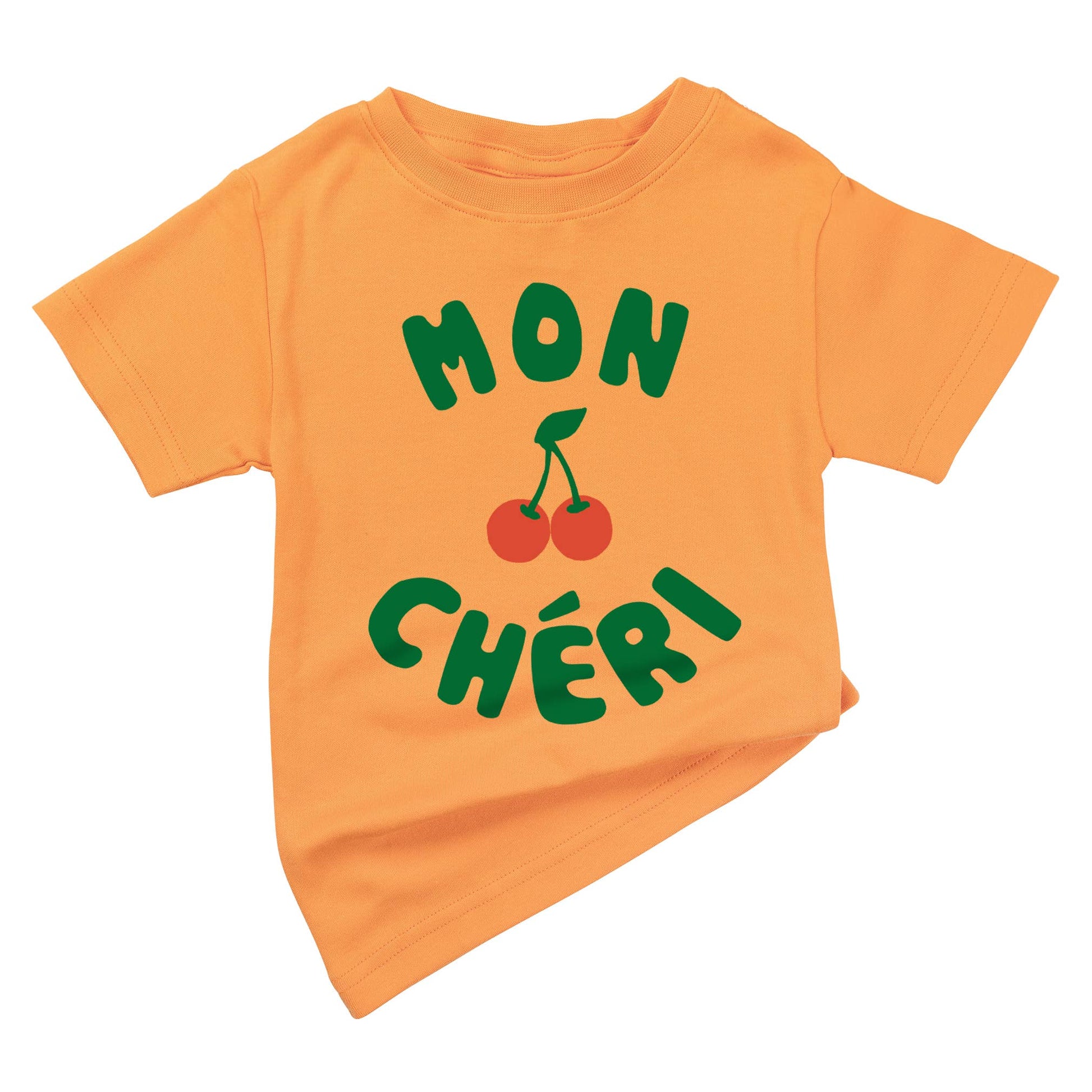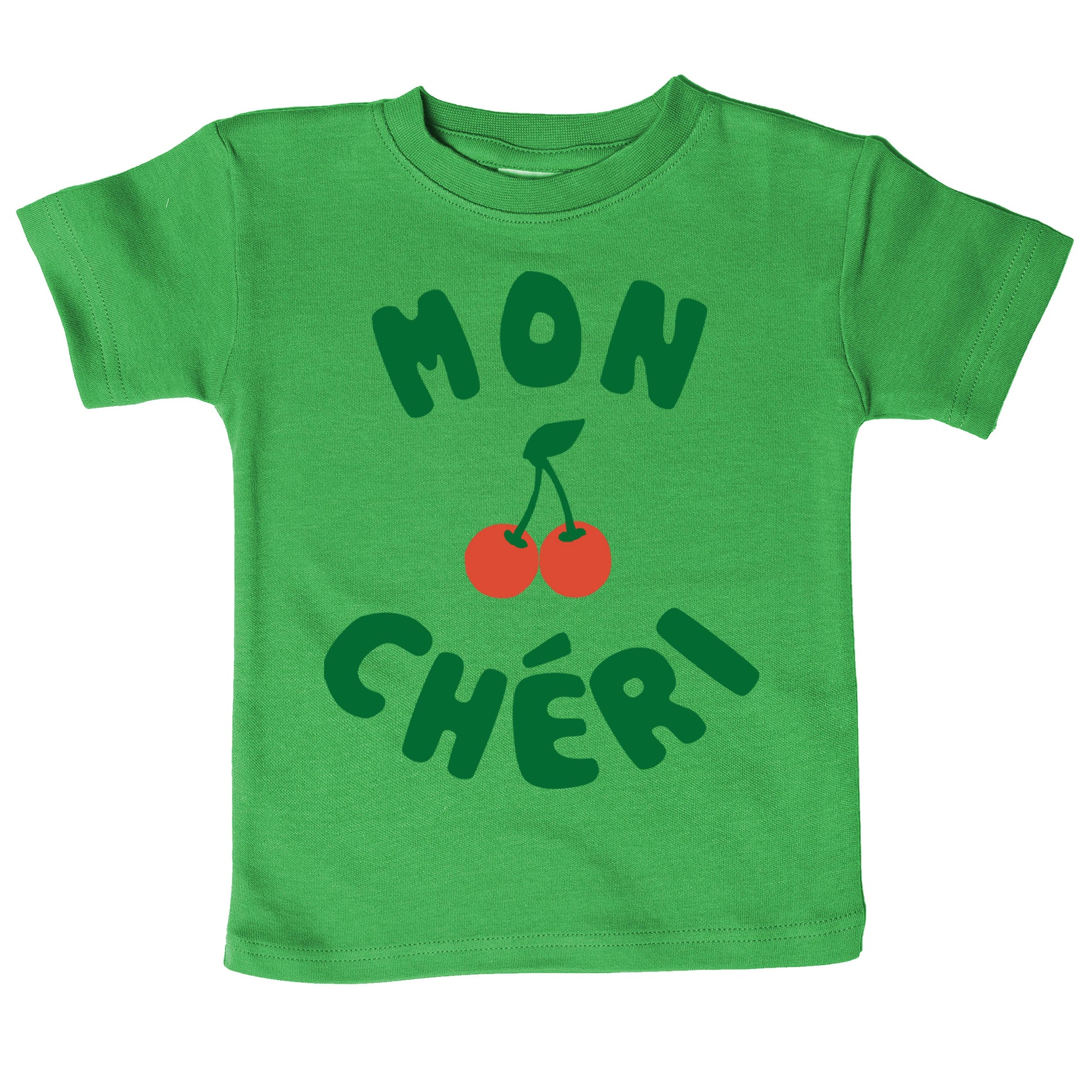 How cute is this baby boy and kids graphic shirt featuring the endearing phrase "mon cheri" accompanied by a charming image of cherries nestled between the words.