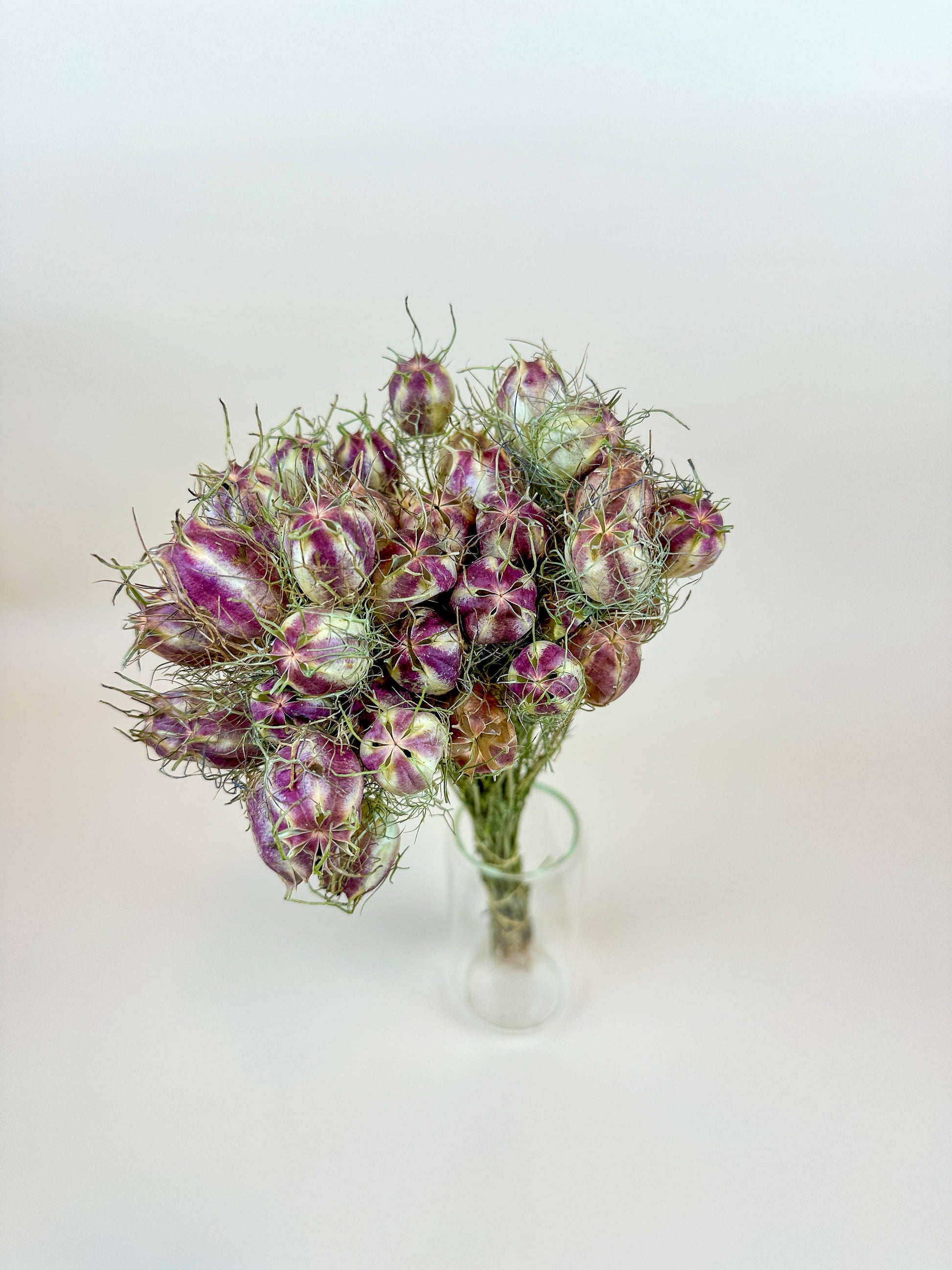 Add whimsical texture and color to your dried floral offerings with Nigella, also known as Love-in-a-Mist. These naturally air-dried seed pods feature a striking combination of green pods with deep burgundy stripes, each surrounded by a delicate, lacy netting that gives them their signature misty look.