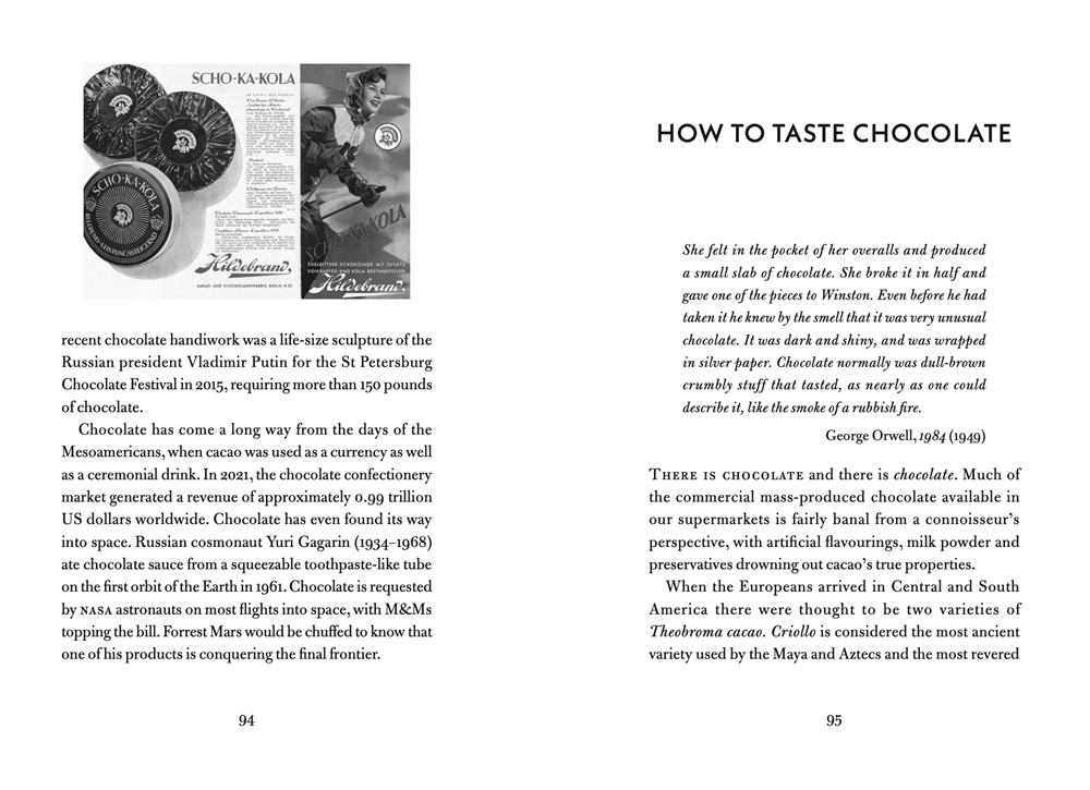 Divided thematically, the book moves between the ceremonial uses of chocolate and its reputation as an aphrodisiac, investigates its reputed health properties and poisonous possibilities. Other chapters reveal the darker side of its production in the Americas, through slave labor and exploitation of indigenous populations, as well as its commercialization as a sweet treat in Western cultures, and chocolate consumption around the world.