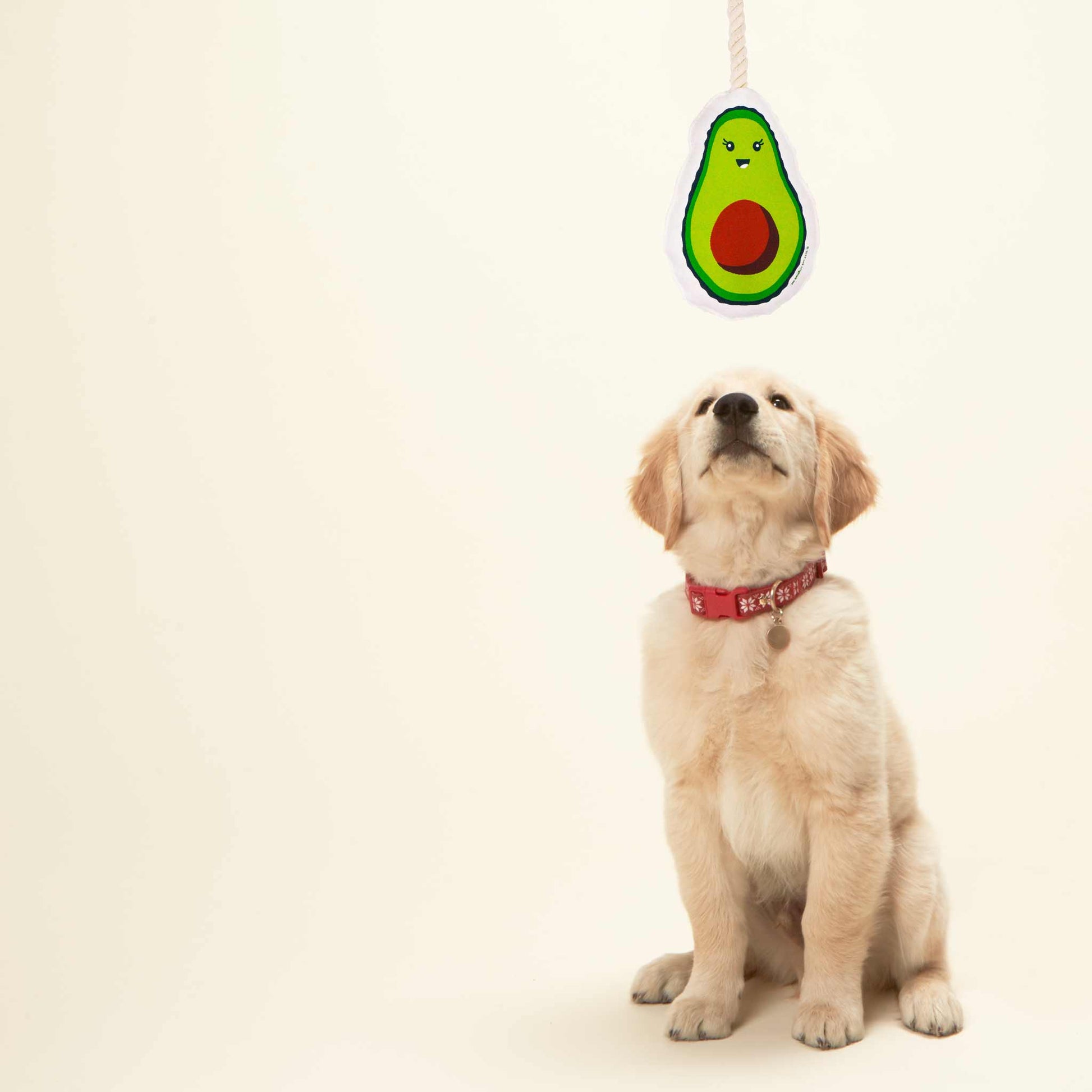The Avocado Dog Toy is the perfect gift for your favorite pup! Our dog toys are fun for your dog, perfect for holding or throwing, and look stylish lying around the house awaiting playtime. Size (inches): appox. 5 .00 w x 1.50 d x 12.50 h Design Features: * Dogs love the cotton rope texture * The back features fun graphics with clever sayings * Includes inner squeaker * The rope handle makes a nice handle and easy to throw * Safe: non-toxic, lead-free, phthalate-free, PVC-free cotton canvas with poly fill stuffing Care: * Spot clean by hand * Line dry * Have fun!