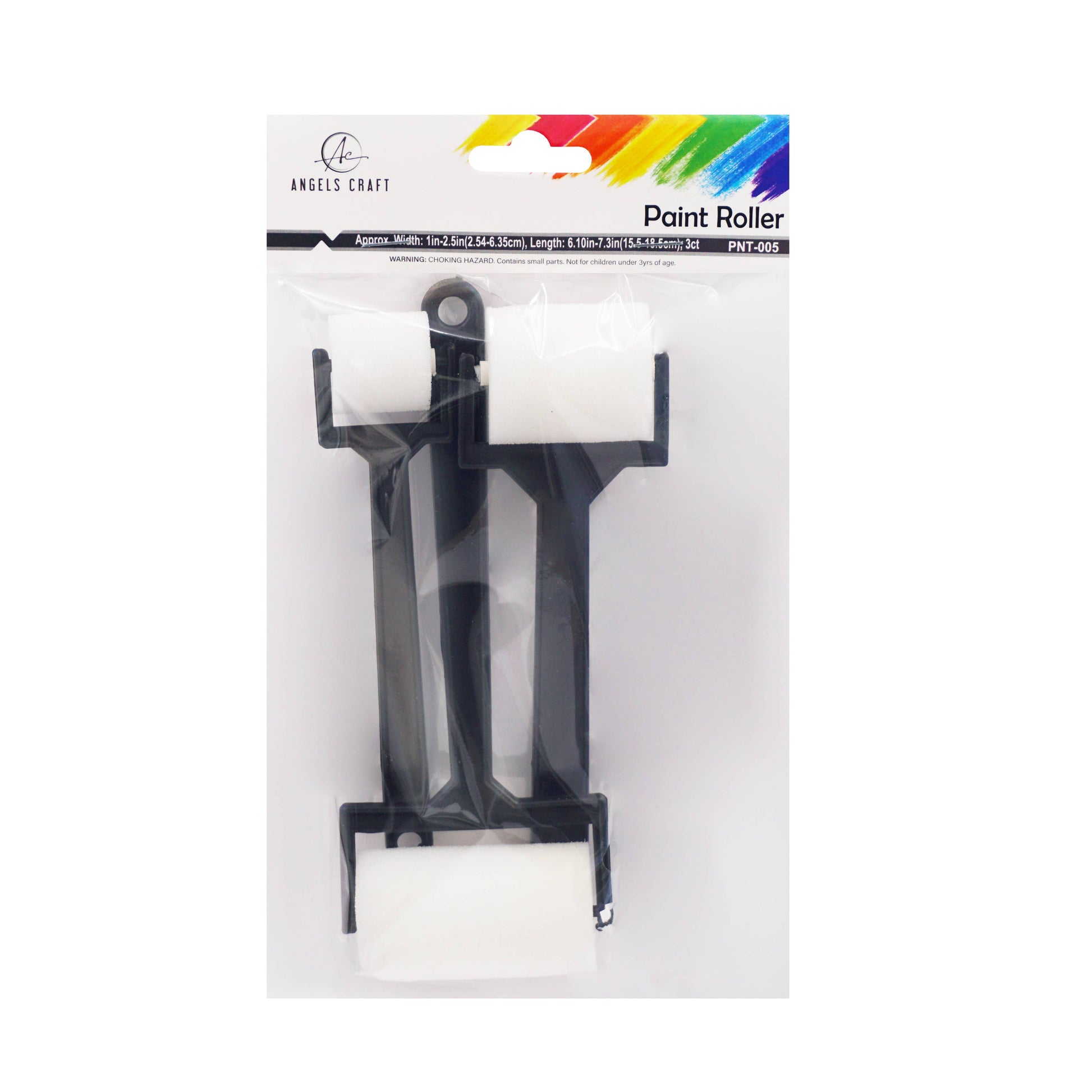 Paint sponge rollers. A pack comes with a variety of sizes, making it perfect for kids' arts & craft activities. Brush sizes range from 1" to 2.5" Each pack comes in a clear opp (poly) bag with a header card for hanging. 1 piece is 1 pack of 3 rollers 1 case is 12 pieces